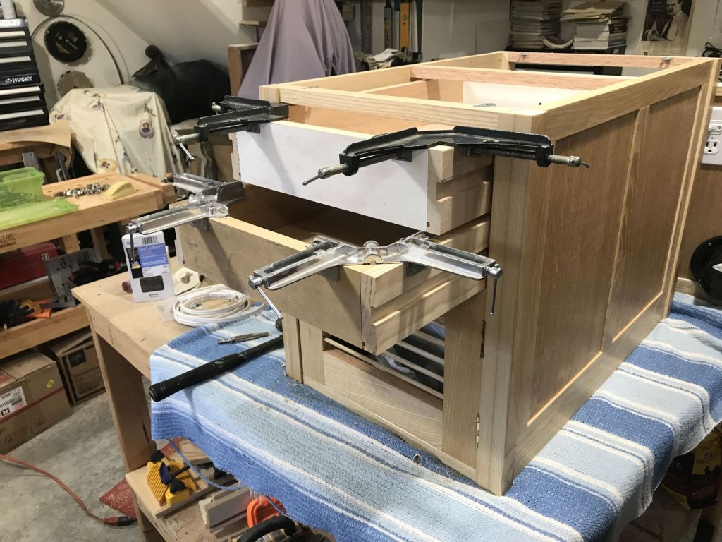 Mistakes were made. The biggest being a failure to properly account for the four vertical posts when I did the top piece, which was made from the best, most attractive cut of wood. The top turned out to be too small so I had to use other pieces to make a bigger one. The first top piece ended up being cut down for use as the two drawer fronts. The next biggest mistake was a goof in installing the door. The louvers ‘point’ up instead of down. That’s not so bad – it may even be beneficial in terms of drawing air from the room rather than the floor. But it wasn’t what I had intended.