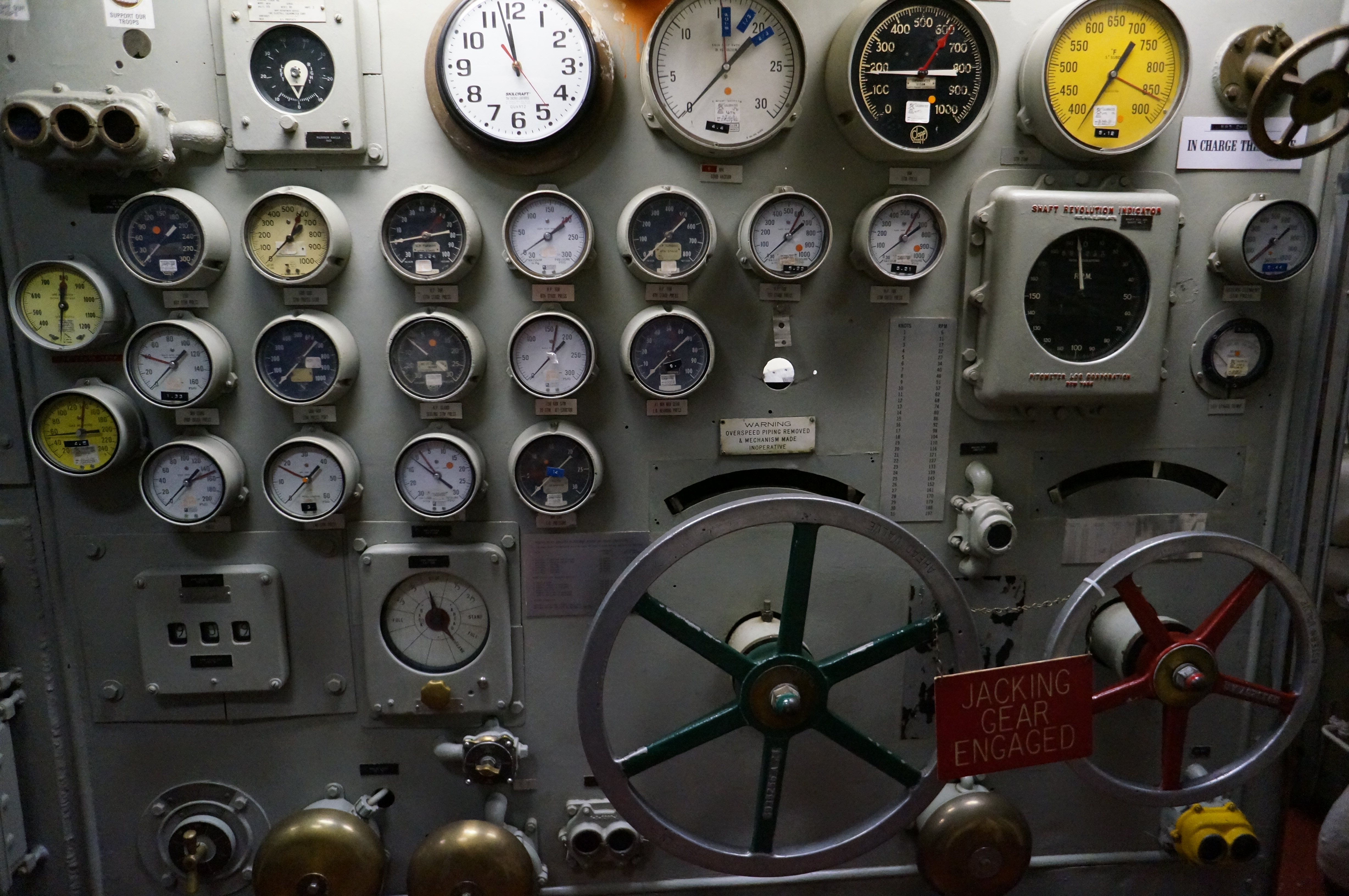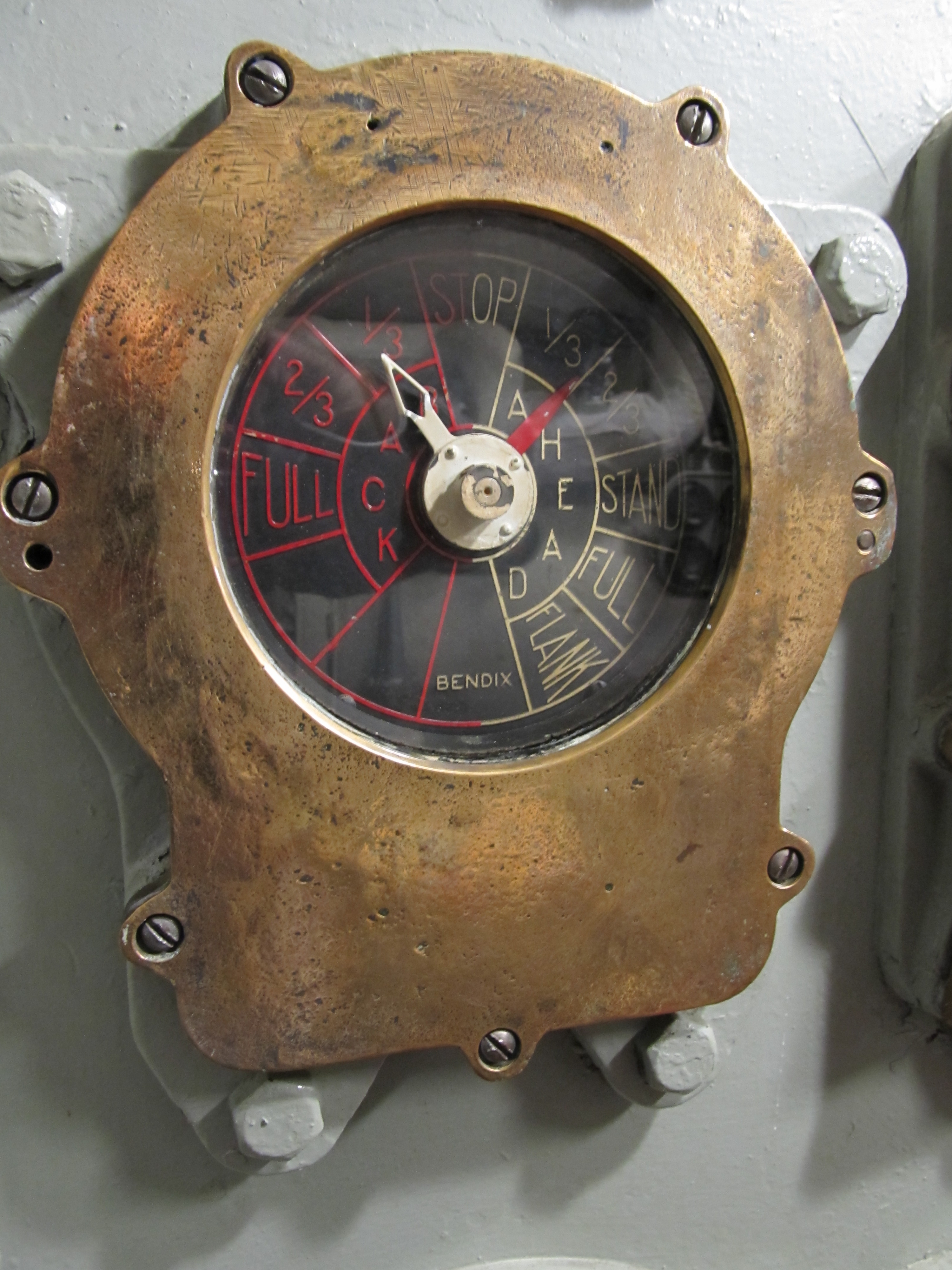USS Wisconsin engine room. The engine order telegraph is just to the left of the larger throttle wheel; steam pressure is indicated on the black faced gauge at the top right.