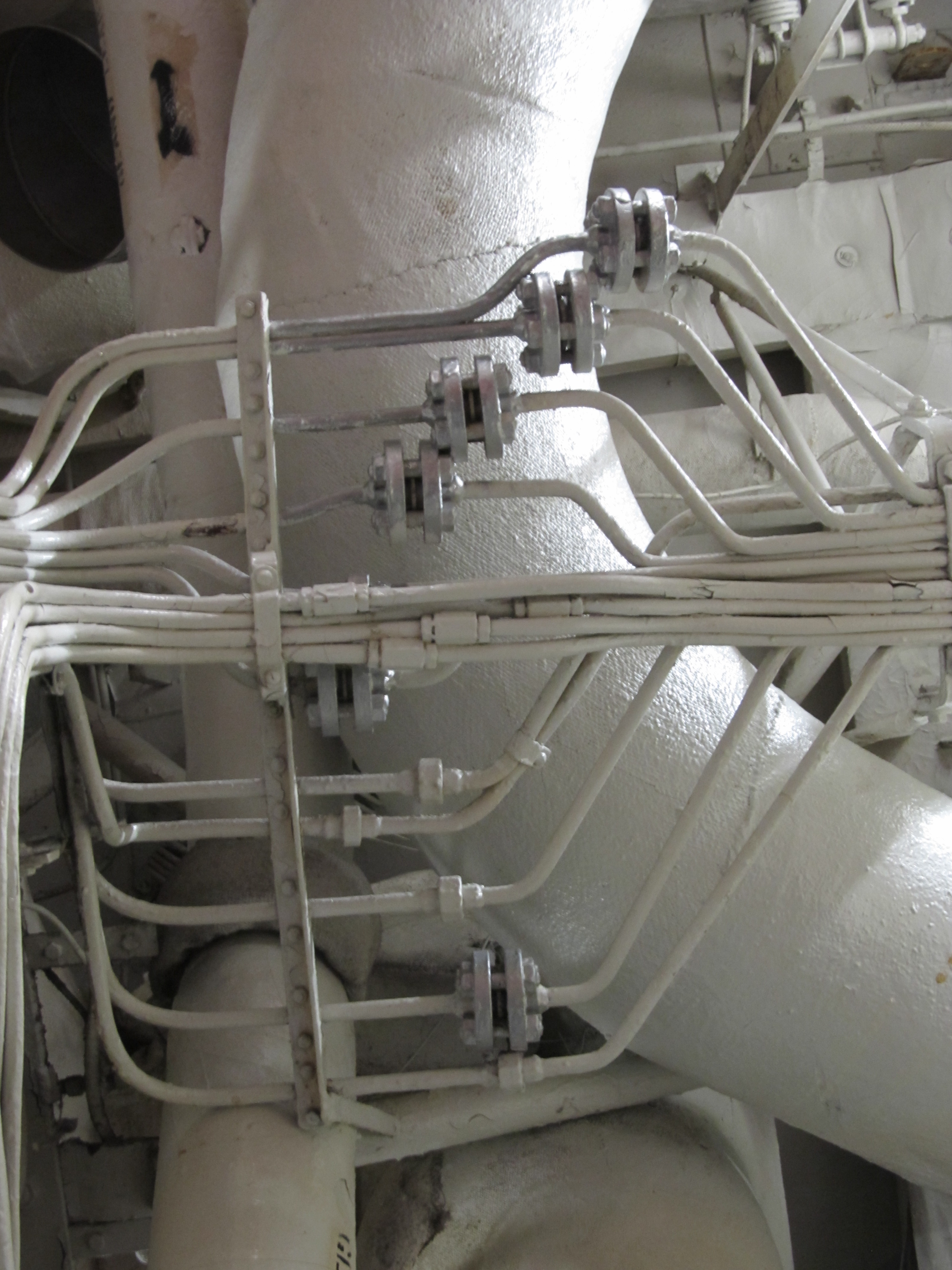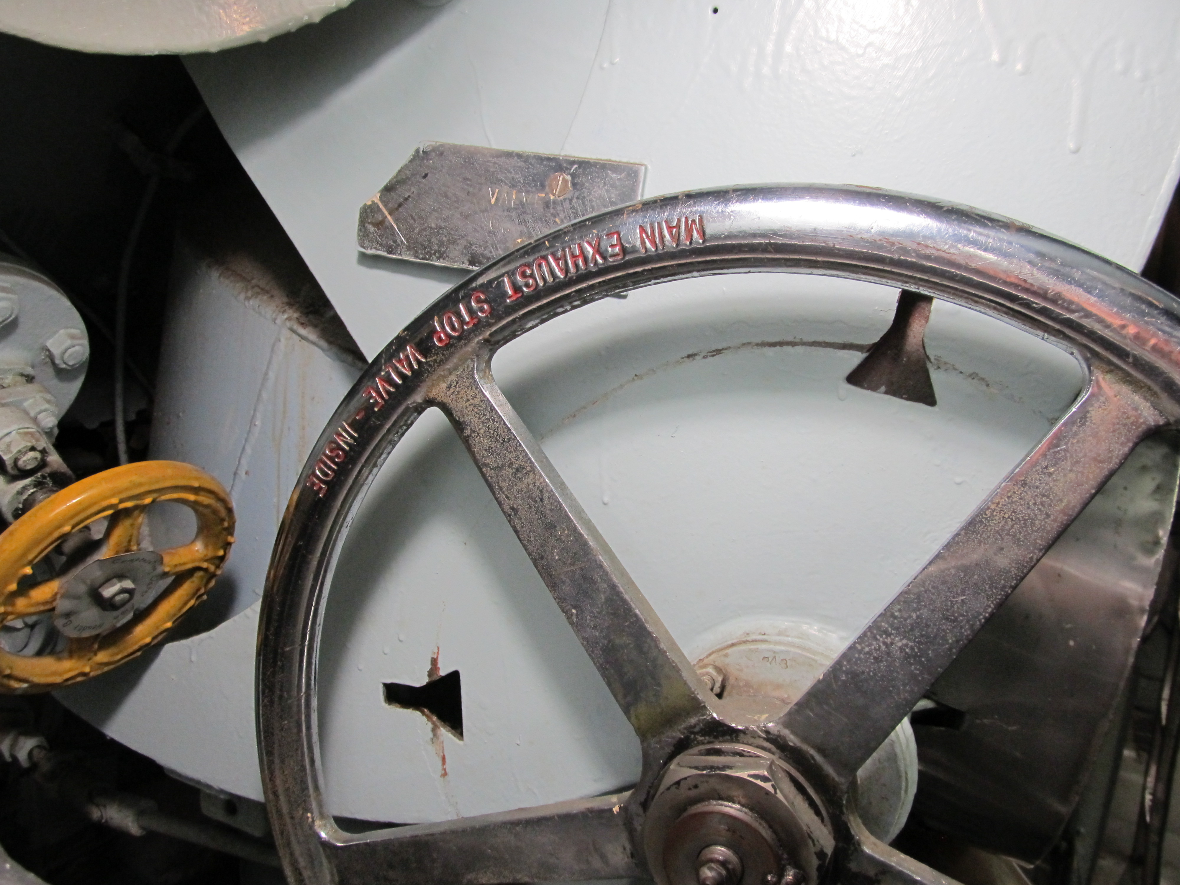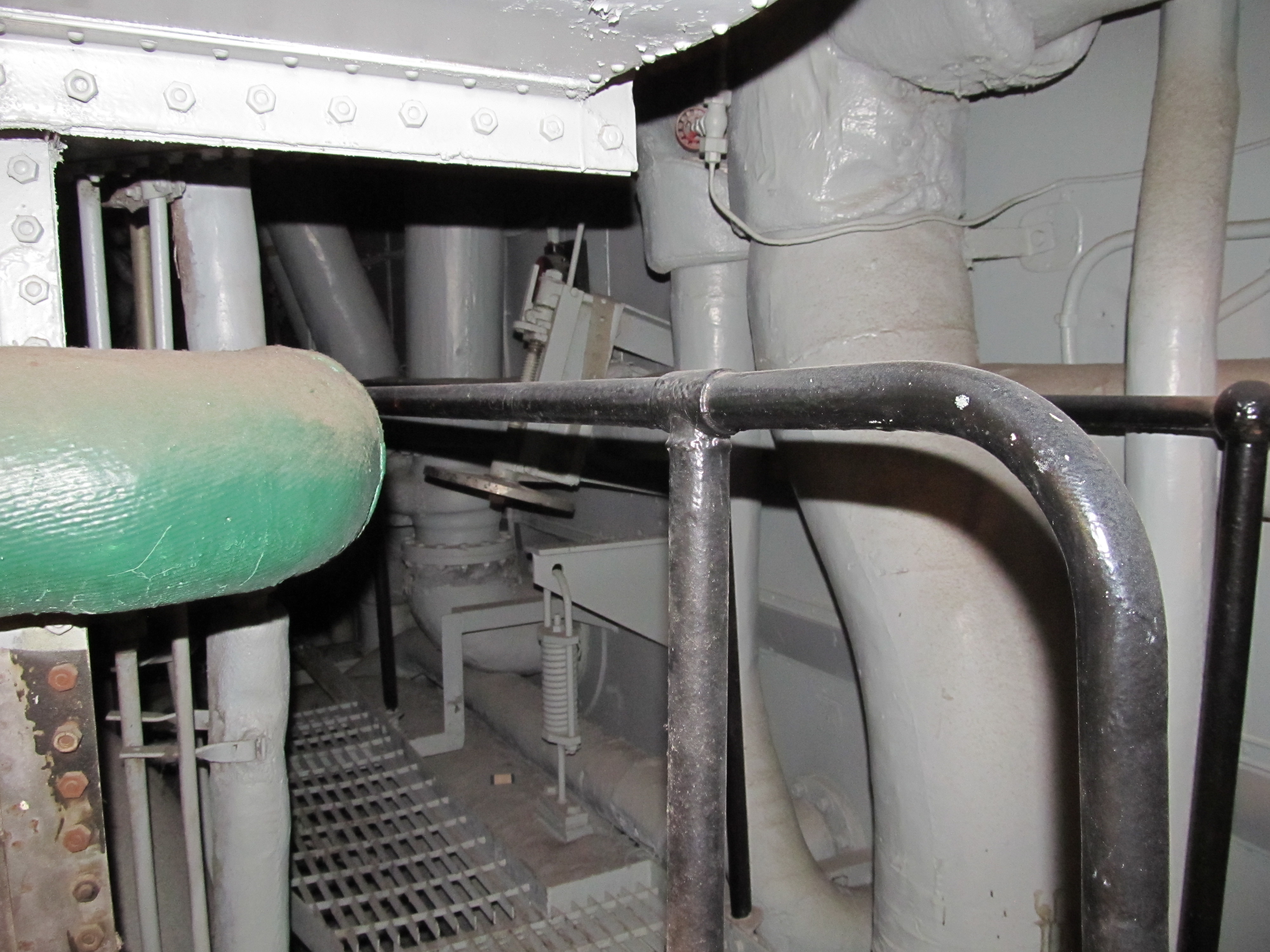 Anyway, after we did the bona fides thing, he launched into the tour, thankfully leaving out a lot of basic stuff he knew I knew. The three of us – him in the lead, me following, she closing doors after us – descended into one of the boiler rooms. He stuck with his script – pointing out the big pieces and running a short video next to one of the boilers. All this while I really wanted to just go off on my own. I already knew what all the big pieces were and could identify most of the little ones, too. After the boiler room tour, we went up, over and down to the engine room. The two compartment did not have direct connection, something I hadn’t realized. That’s a damage control thing – if a boiler blows or floods, it doesn’t take out the corresponding engines, which can be crossfed from another boiler thus maintaining maximum speed capability for the ship.