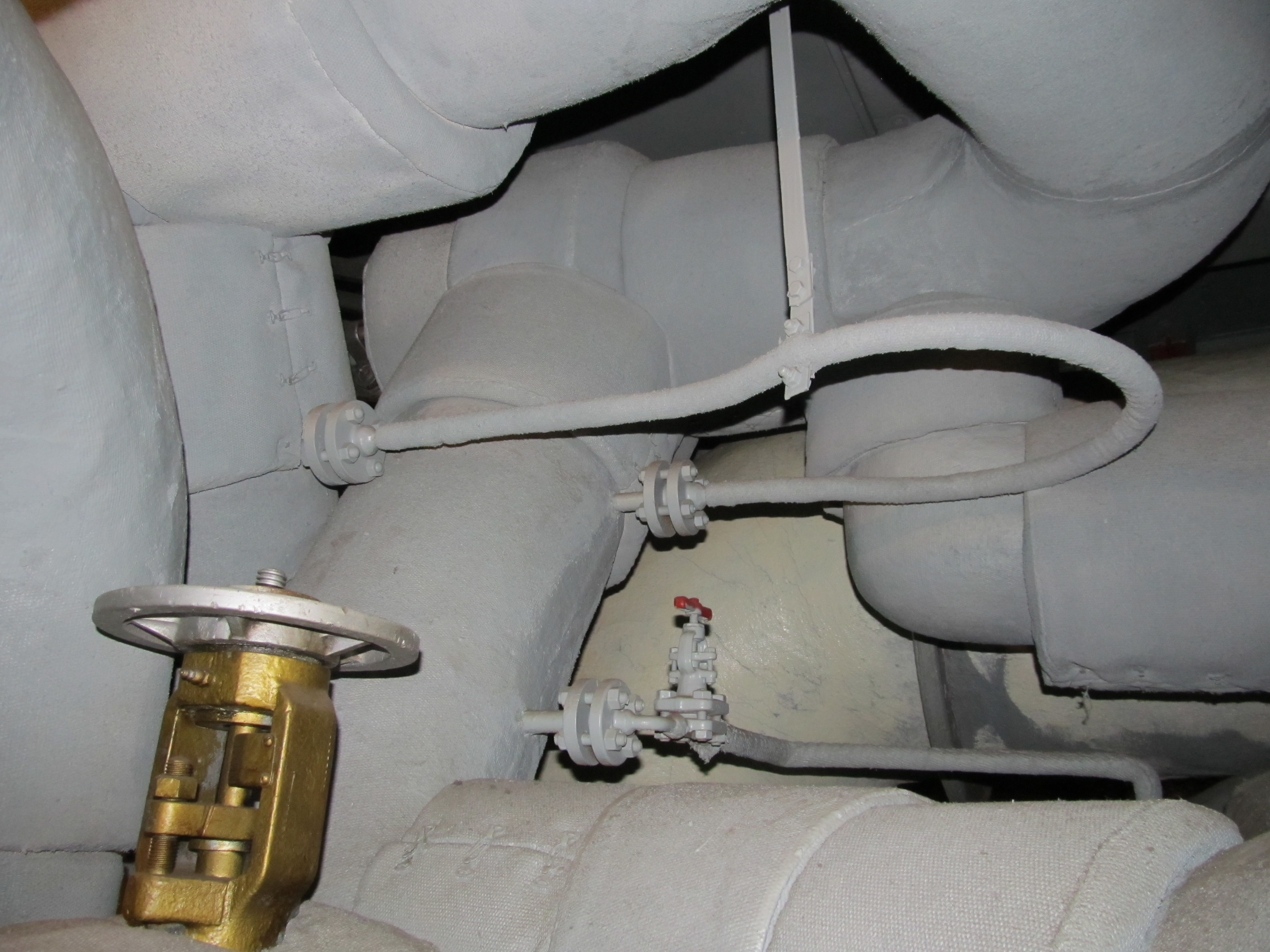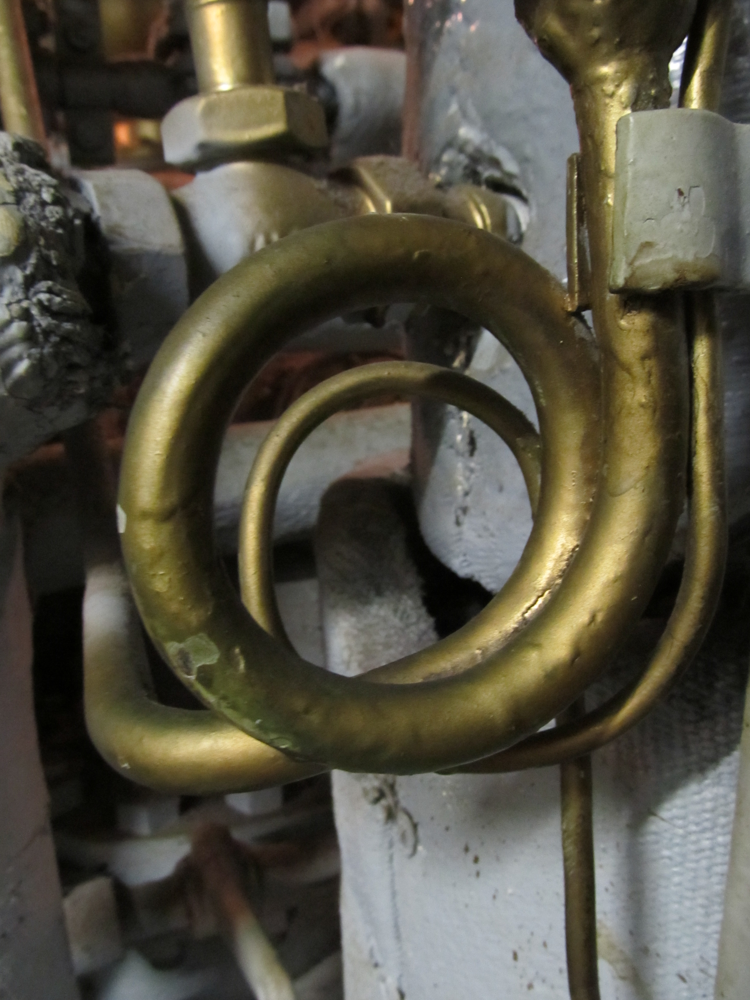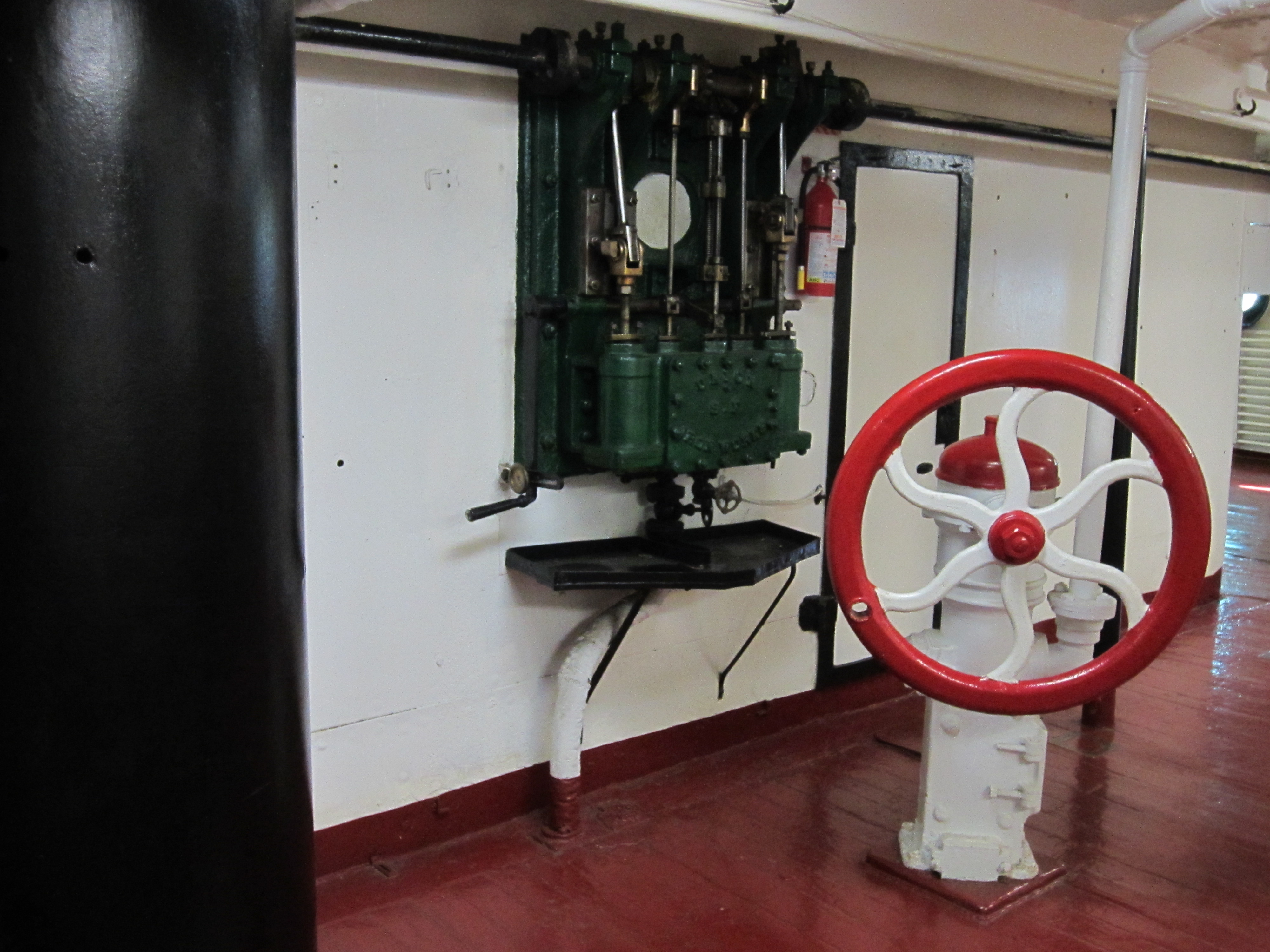 Anyway, after we did the bona fides thing, he launched into the tour, thankfully leaving out a lot of basic stuff he knew I knew. The three of us – him in the lead, me following, she closing doors after us – descended into one of the boiler rooms. He stuck with his script – pointing out the big pieces and running a short video next to one of the boilers. All this while I really wanted to just go off on my own. I already knew what all the big pieces were and could identify most of the little ones, too. After the boiler room tour, we went up, over and down to the engine room. The two compartment did not have direct connection, something I hadn’t realized. That’s a damage control thing – if a boiler blows or floods, it doesn’t take out the corresponding engines, which can be crossfed from another boiler thus maintaining maximum speed capability for the ship.