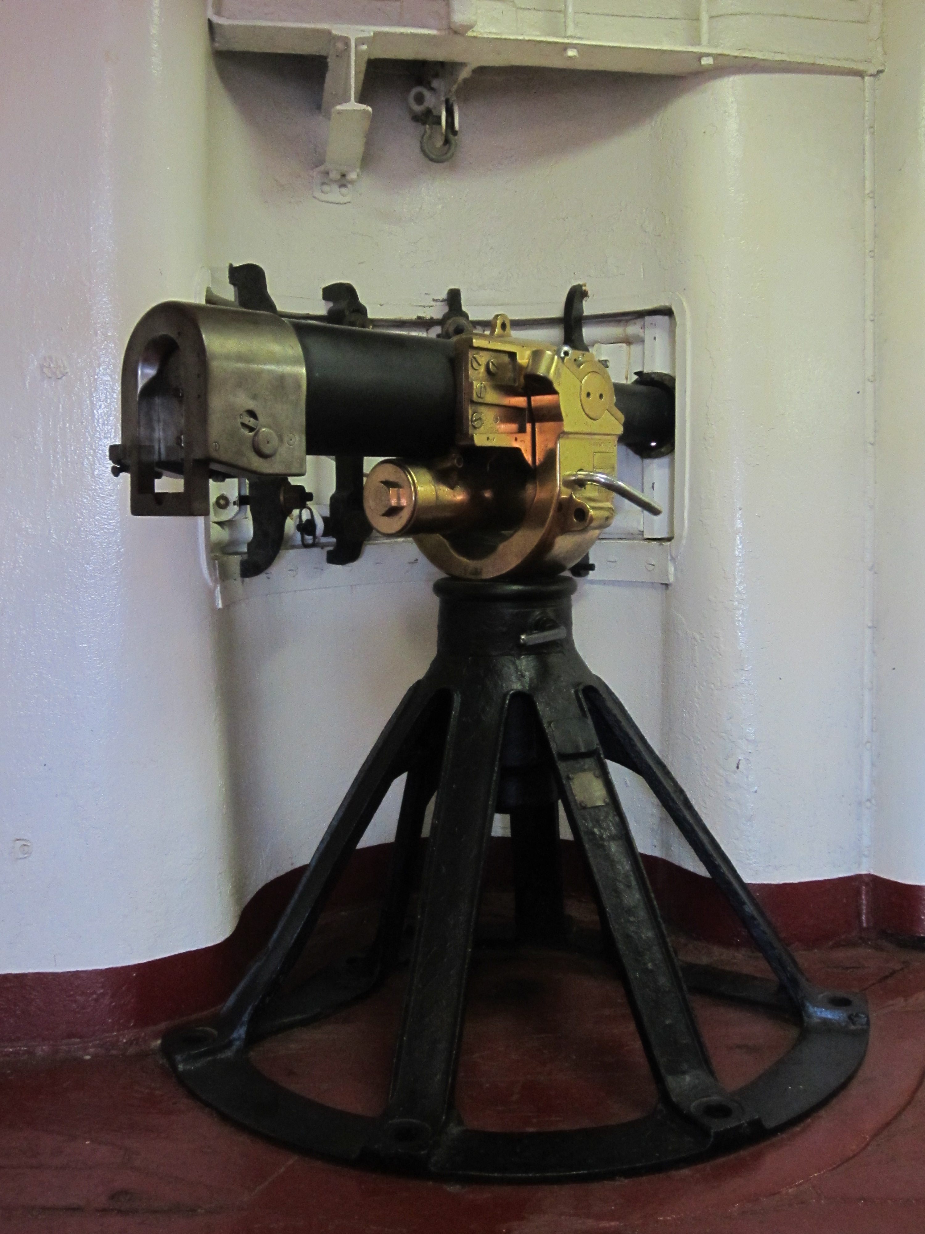 One of my favorite photos taken on the Olympia isn’t pretty like those above. It’s a shot seeming to show one of the ship’s smaller guns (2.24 inch, according to Wikipedia) trained on an enemy warship across the river. That ship is the USS New Jersey, another of the WWII-era big battleships.